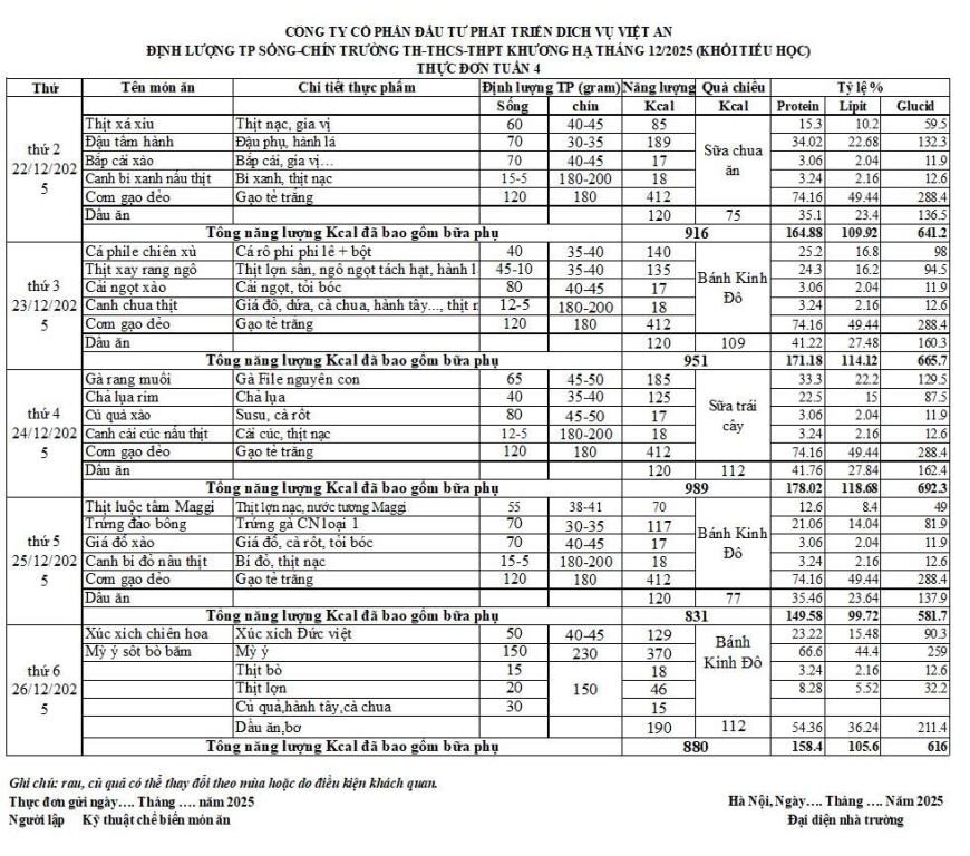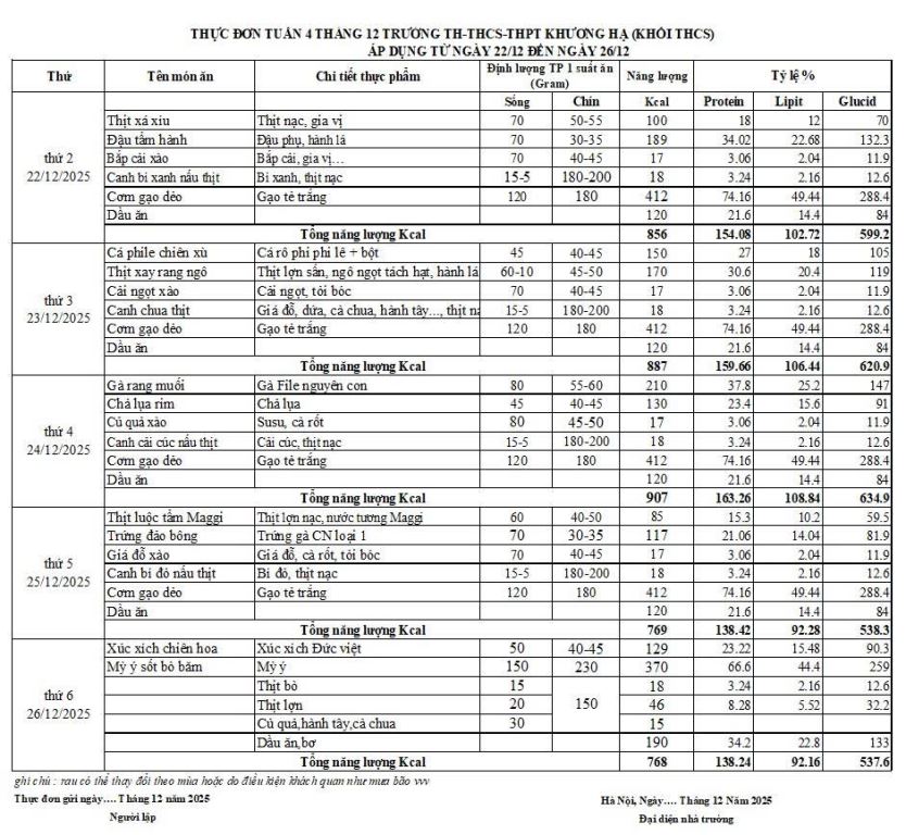 THỰC ĐƠN BÁN TRÚ TUẦN TỪ 22/12/2025 ĐẾN 26/12/2025