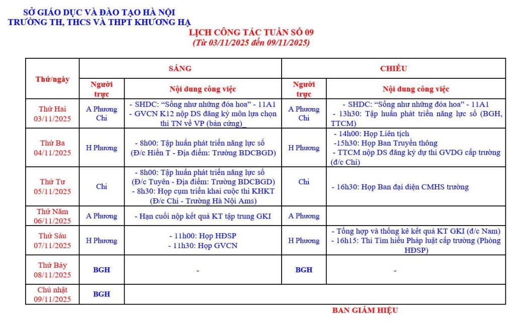 LỊCH CÔNG TÁC TUẦN SỐ 09 TỪ 03/11/2025 ĐẾN 08/11/2025