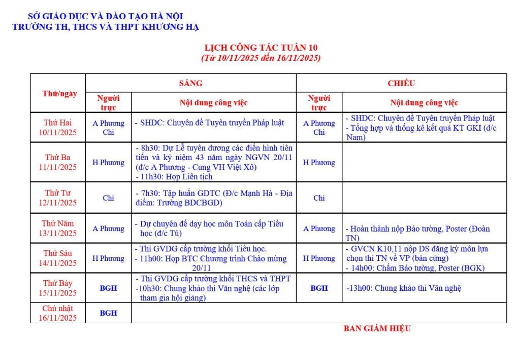 LỊCH CÔNG TÁC TUẦN 10 TỪ 10/11/2025 ĐẾN 16/11/2025