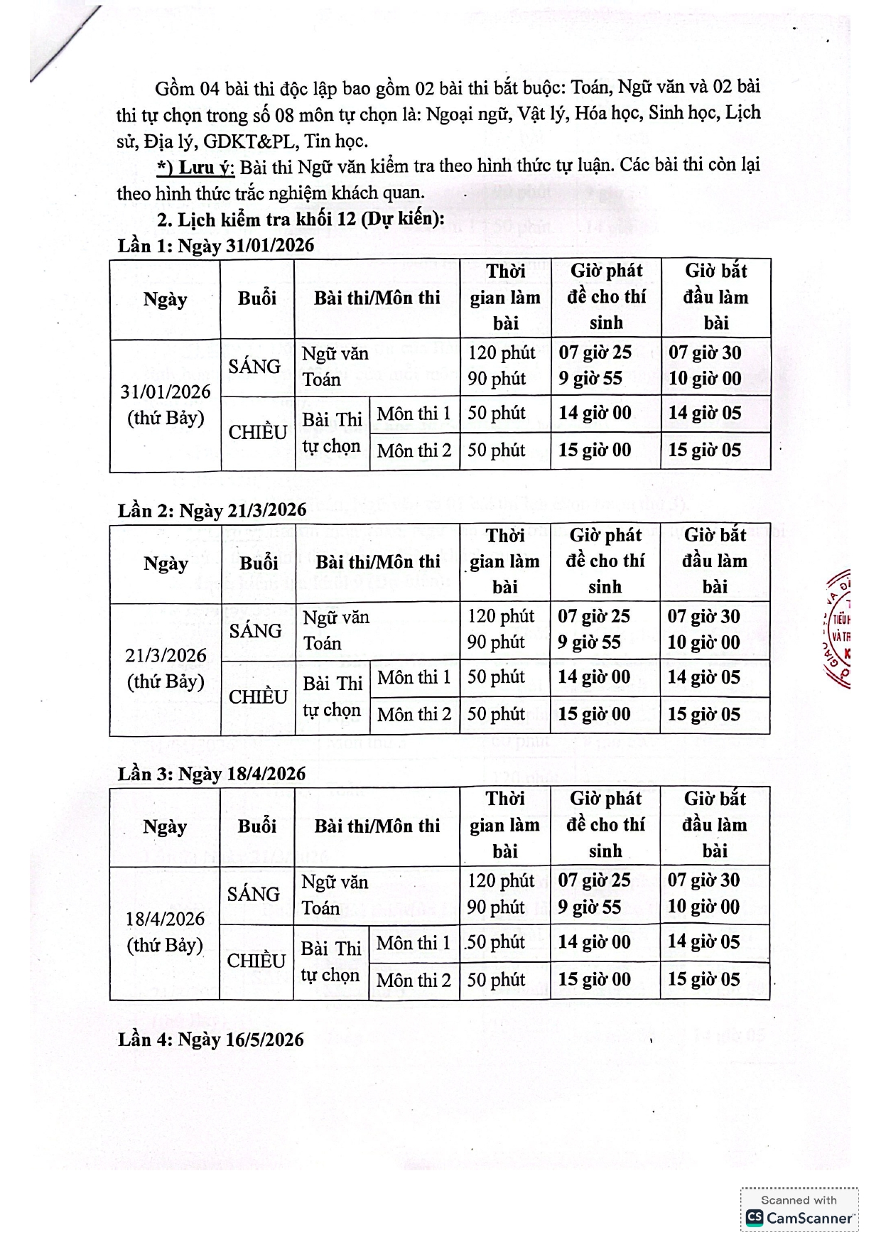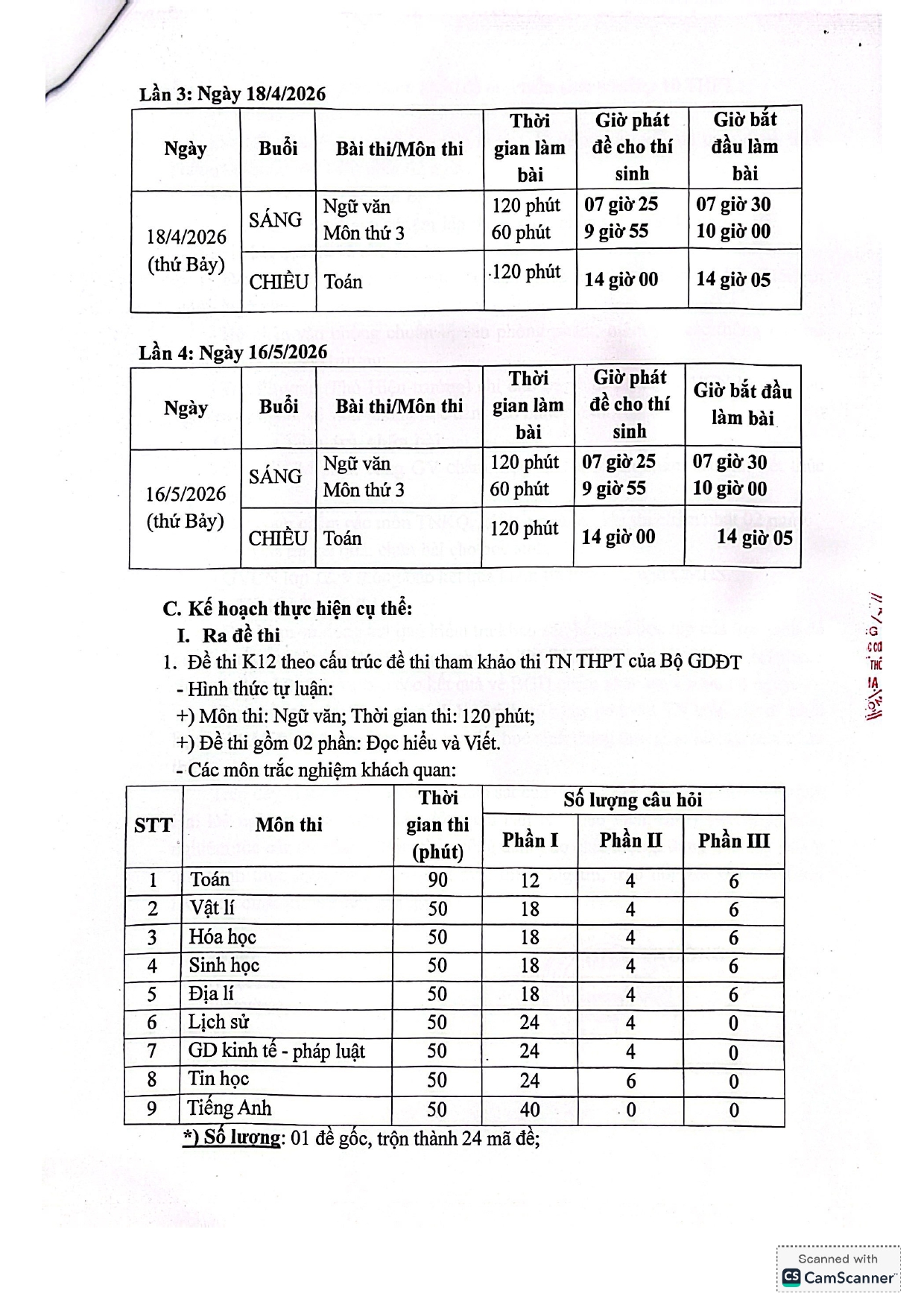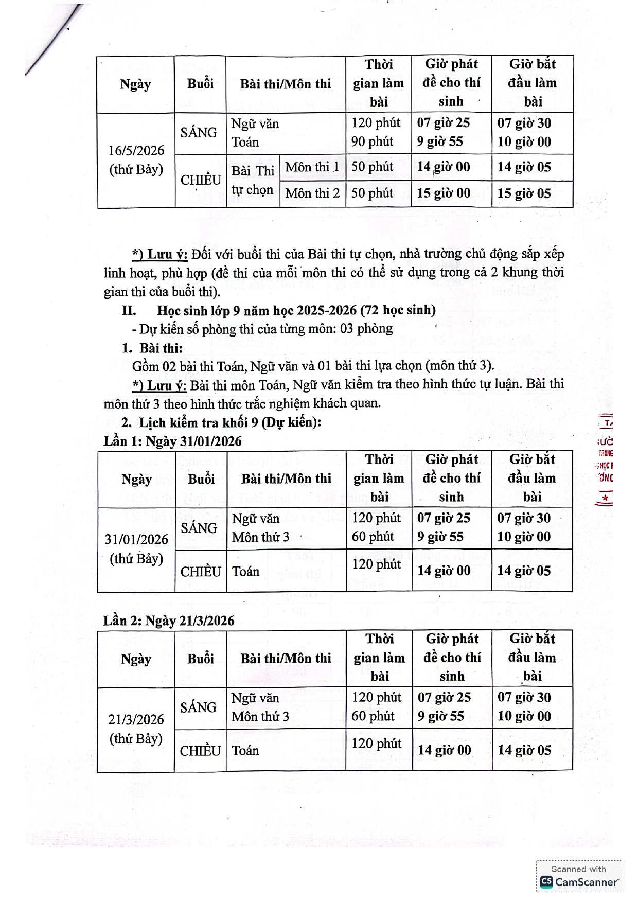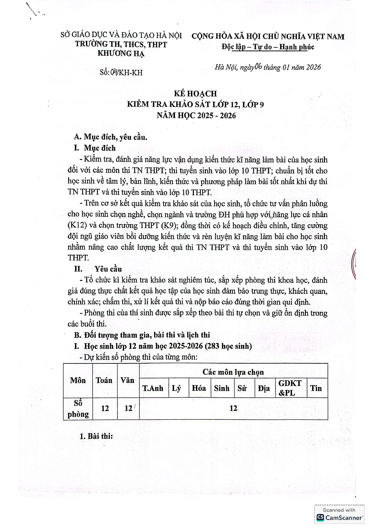 KẾ HOẠCH KIỂM TRA KHẢO SÁT LỚP 12, LỚP 9 NĂM HỌC 2025-2026