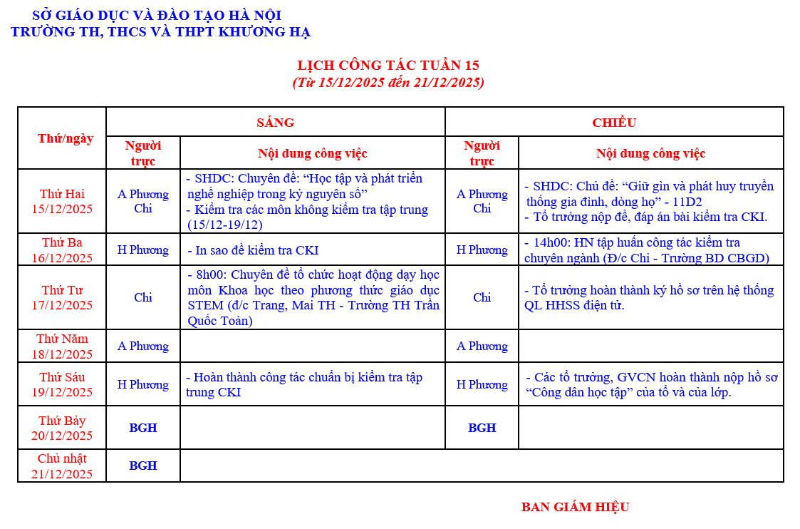 LỊCH CÔNG TÁC TUẦN 15 TỪ 15/12/2025 ĐẾN 21/12/2025