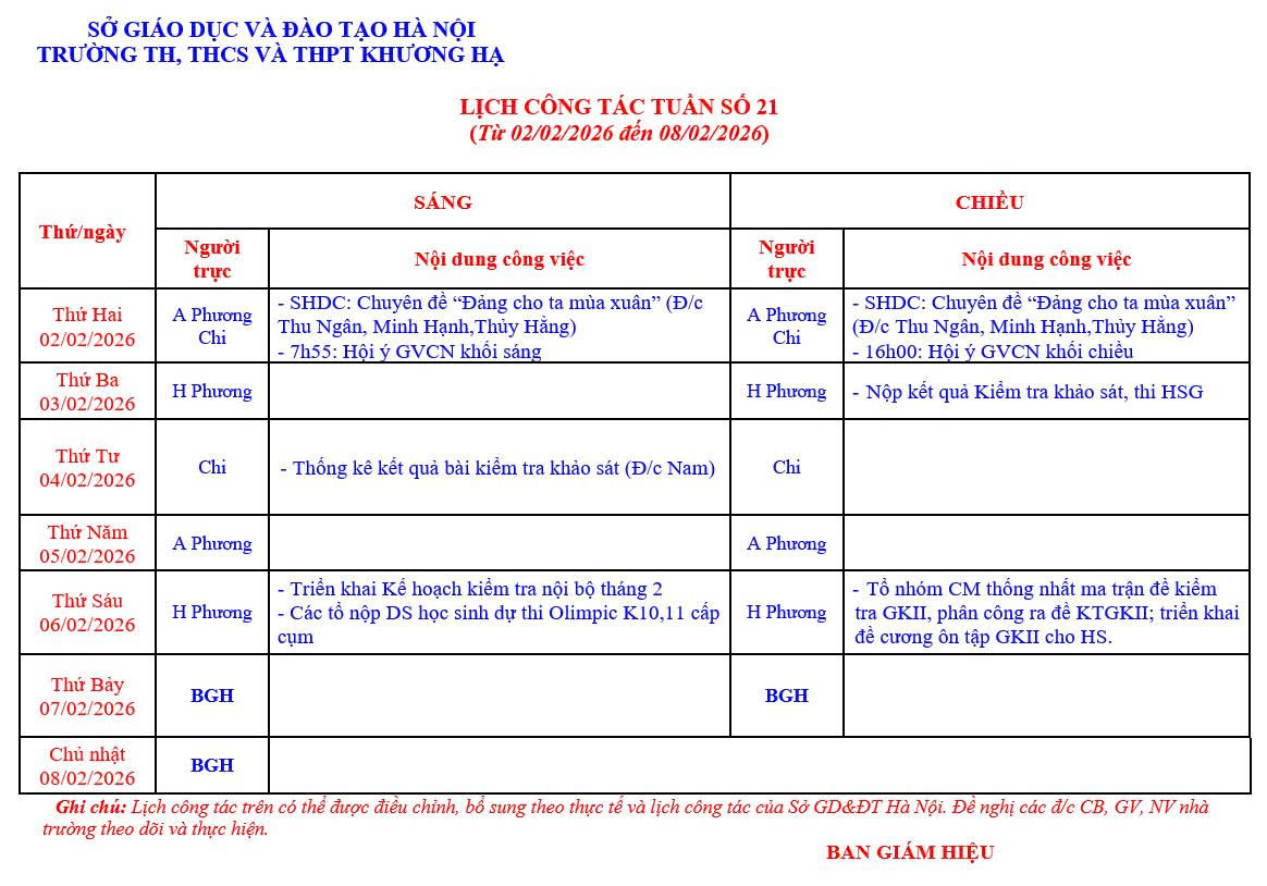 LỊCH CÔNG TÁC TUẦN 21 TỪ 02/02/2026 ĐẾN 08/02/2026