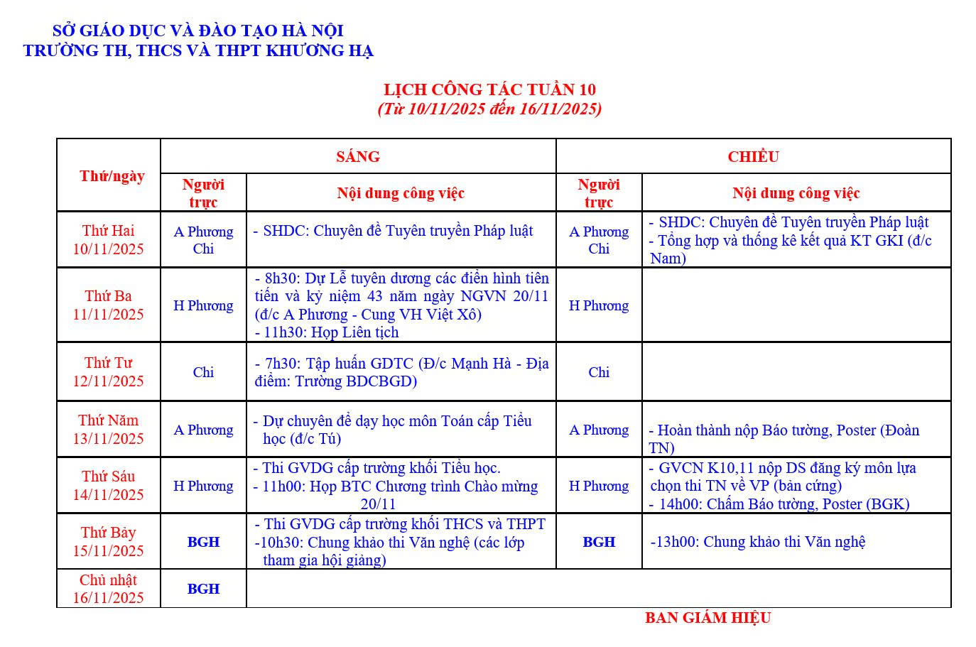 LỊCH CÔNG TÁC TUẦN 10 TỪ 10/11/2025 ĐẾN 16/11/2025