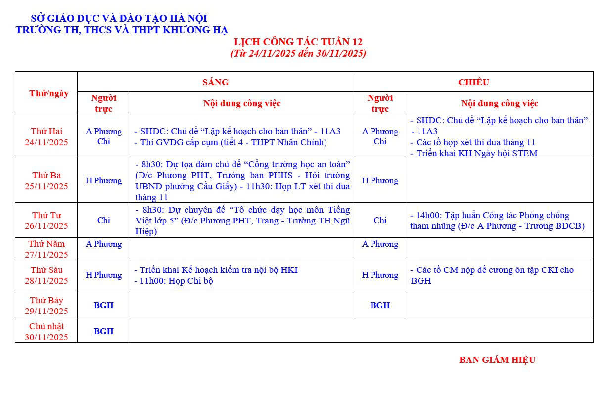LỊCH CÔNG TÁC TUẦN 12 TỪ 24/11/2025 ĐẾN 30/11/2025