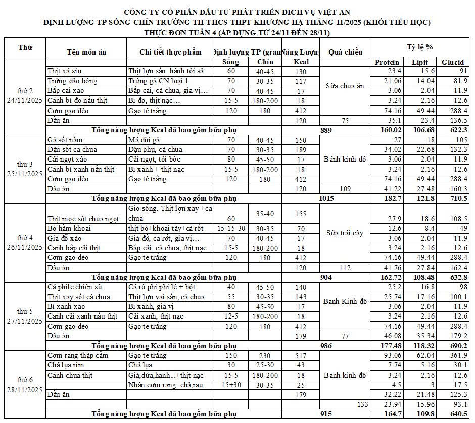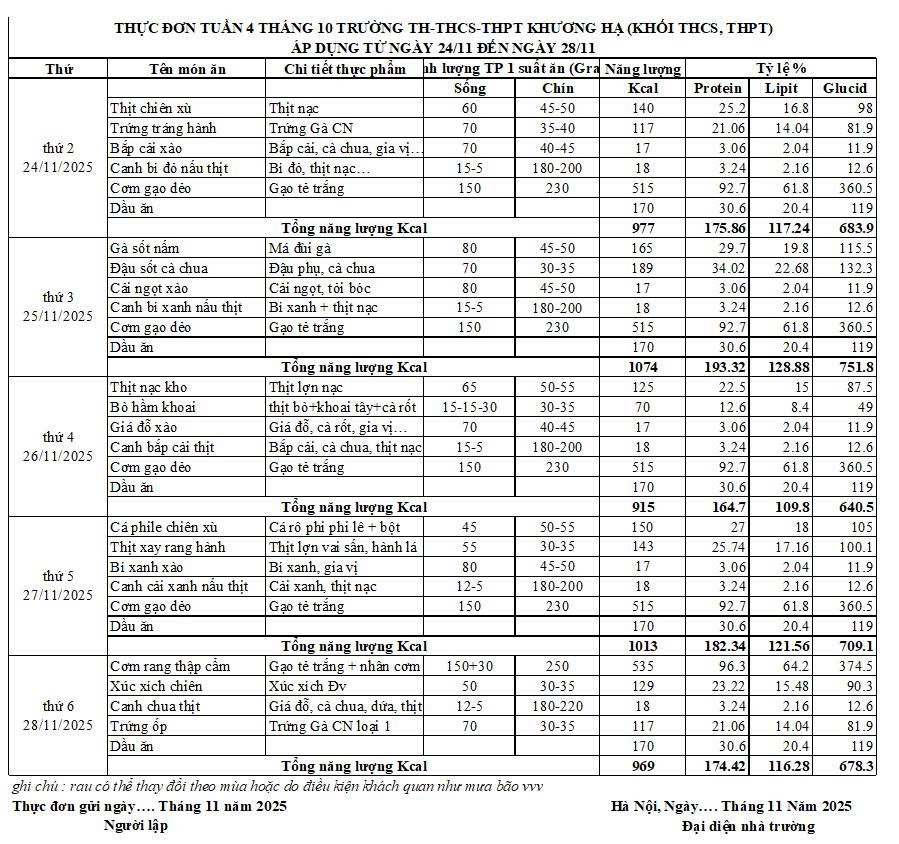 THỰC ĐƠN BÁN TRÚ TUẦN 12 TỪ 24/11/2025 ĐẾN 28/11/2025