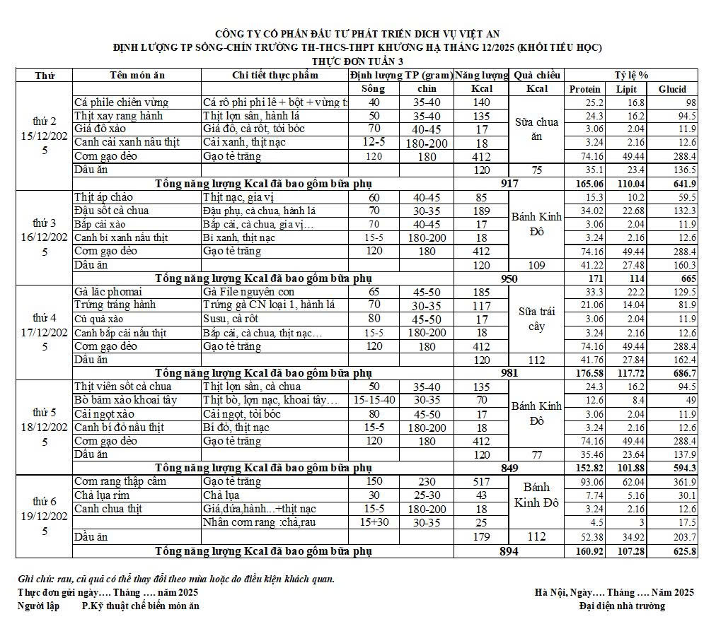 THỰC ĐƠN BÁN TRÚ TUẦN TỪ 15/12/2025 ĐẾN 19/12/2025
