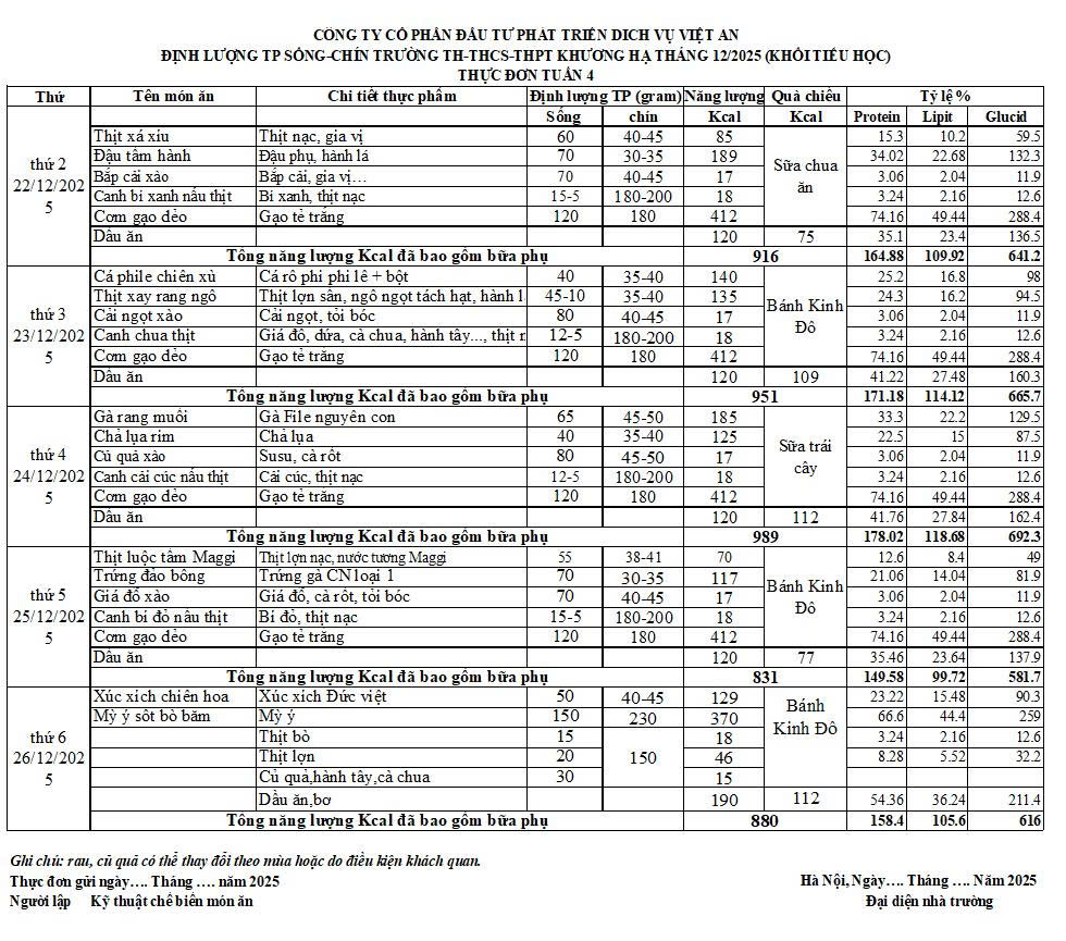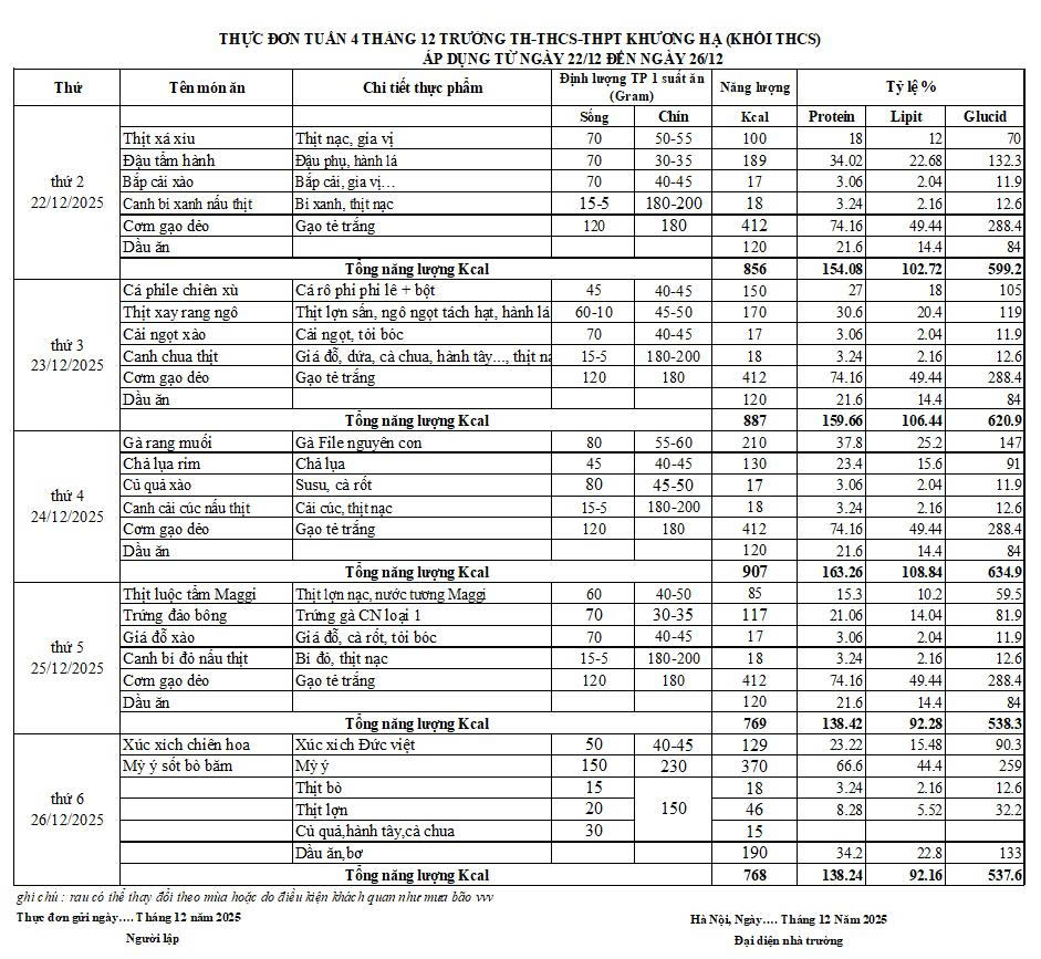 THỰC DƠN BÁN TRÚ TUẦN TỪ 22/12/2025 ĐẾN 26/12/2025